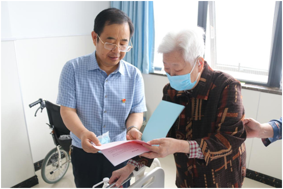 院党委副书记兼院长曹同斌向离休老干部李舜富送达《一员一卡一册》,为其配备一名联络员、