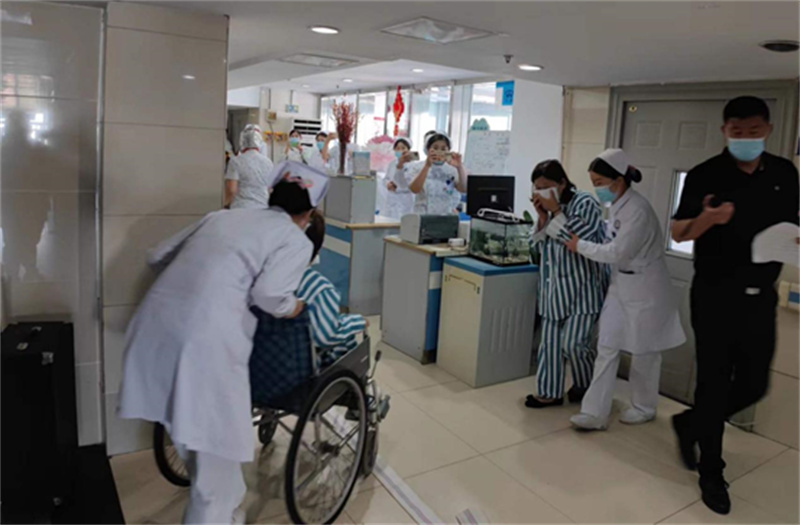 最后,在康复二病区开展应急疏散演练活动,模拟病区卫生间着火冒烟。演练前对演练人员讲解了此次演练活动的具体内容,并对应急防范、快速疏散患者、采取应急措施等方面做了详细的介绍。在现场发现火情后,病区人员能按照制定的应急疏散演练方案,熟练使用灭火设施,按照预定的逃生路线,所有职工及患者都安全有序逃离火灾现场。