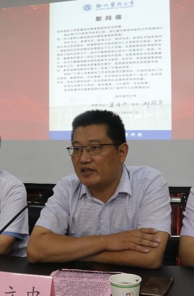 徐州医科大学第二临床学院刘立忠书记宣读了徐州医科大学慰问信,并代表所有教学学校祝贺词,他表示徐州医科大学康复治疗专业的创立与发展离不开徐州市康复医院的付出,近年来在医院建设及人才培养取得一定成绩,今后双方还要保持密切联系,进一步促进教学工作走实走深。
