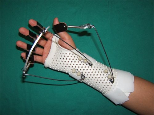 夹板保持腕关节屈曲45°,掌指关节屈曲 40°。患者掌指关节与指间关节在夹板内,做助力下的被动屈曲和主动伸展活动。