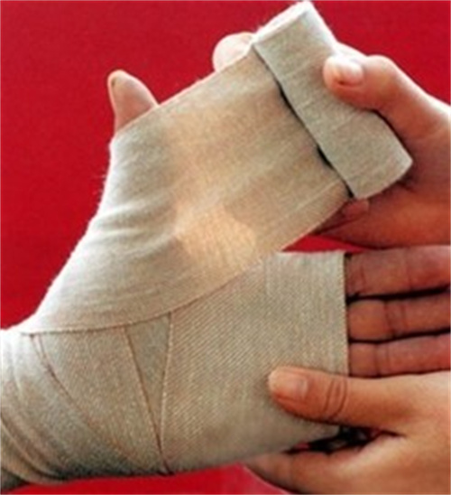 (4)伤手持续抬高,压力治疗(弹力绷带从指尖到指根缠绕手指,然后放开。重复进行,一日数次。单个手指肿胀可以使用弹力指套)。