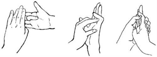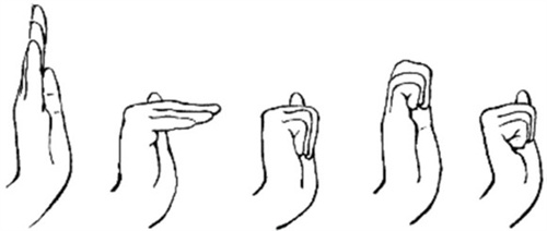 (5)钩拳练习:将手摆成鸭嘴状,最大限度屈曲近指和远指关节的同时伸直掌指关节,然后,再使手回到鸭嘴状。