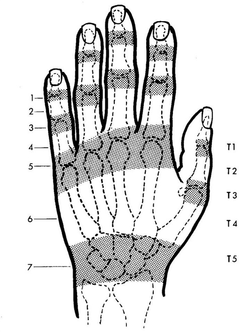 Ⅱ区:包括拇指指间关节至掌指关节间的区域