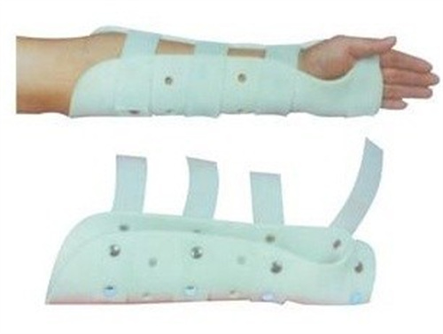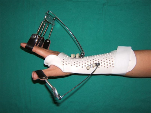 石膏托固定腕关节于40°背伸、掌指关节于40°屈曲,近指关节于0°位,但远端指关节自由活动。