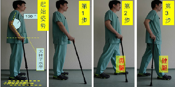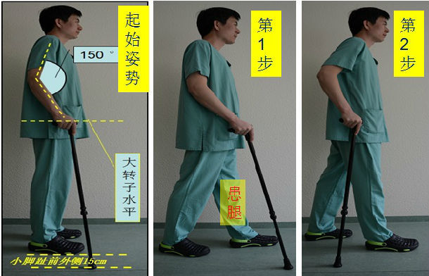 “两点步”方式:调整高度,身体直立,将拐置于小脚趾前外侧约15-20cm,紧实接触地面。握紧扶手,用手臂的力量支撑身体。第1步拐和患腿同出,第2步迈出好腿,依次重复,此种步态方式快于“三点步”,多为轻病例或恢复后期患者应用。