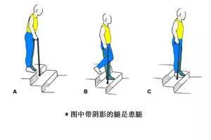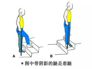 4、同时向上移动手杖和患腿一级台阶,与健侧腿平级(如果楼梯有扶手,可使用扶手帮助上楼)