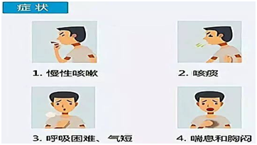 3、气短或呼吸困难 早期在剧烈活动时出现,逐渐加重,以至在日常生活活动甚至休息时也感到气短,是COPD的标志性症状。