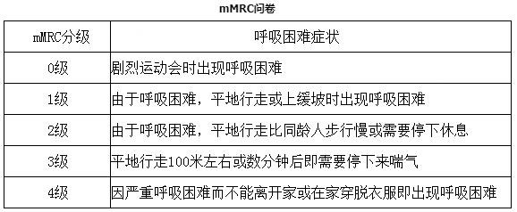 可采用改良版英国医学研究委员会呼吸困难问卷(mMRC问卷)评估(下表所示)