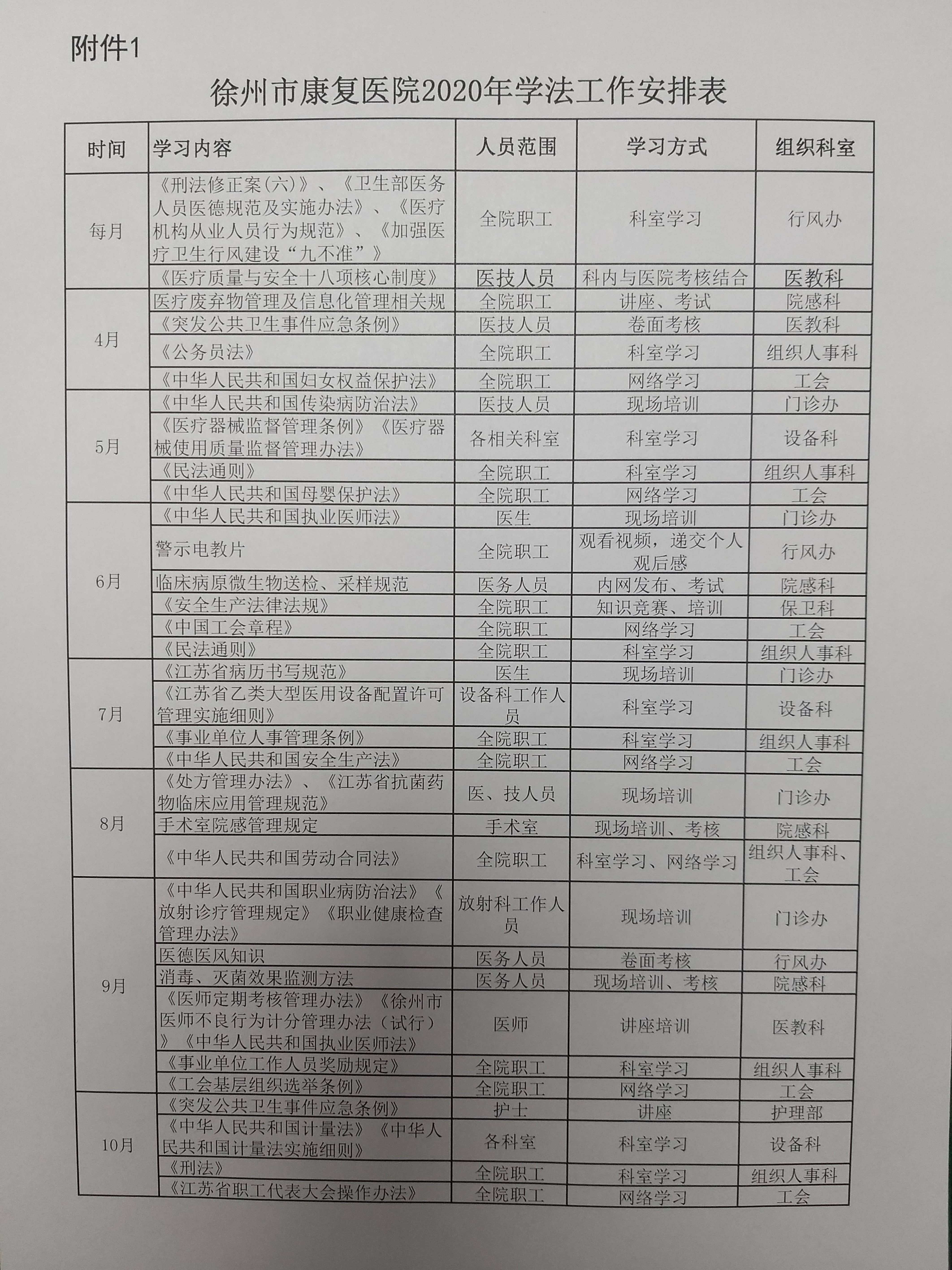 附件:1. 徐州市康复医院2020年学法工作安排表