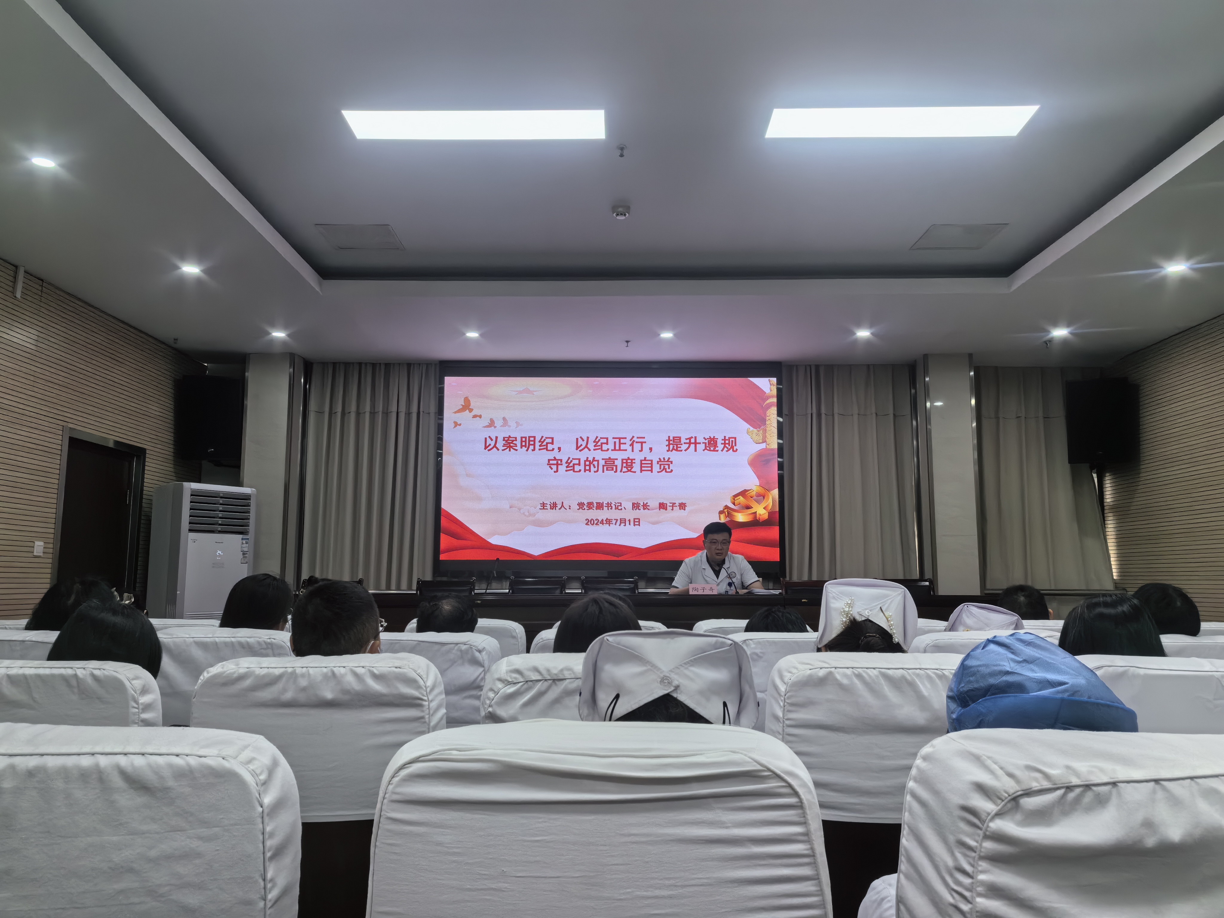 陶子奇代表院党委作了《以案明纪 以纪正行 提升遵规守纪的高度自觉》的专题党课。在党课上,陶子奇结合医院工作实际和自身学习体会,围绕深刻认识新《条例》修订的重要意义,准确把握新《条例》修订的鲜明特点,全面理解新《条例》修订的内涵要义,坚决贯彻执行“六项纪律”并从三个方面进行解读,通过典型案例、具体事件等多维度,系统分析遵守党纪的重要性,引导党员干部增强纪律规矩意识,把遵规守纪刻印于心,外化于行。