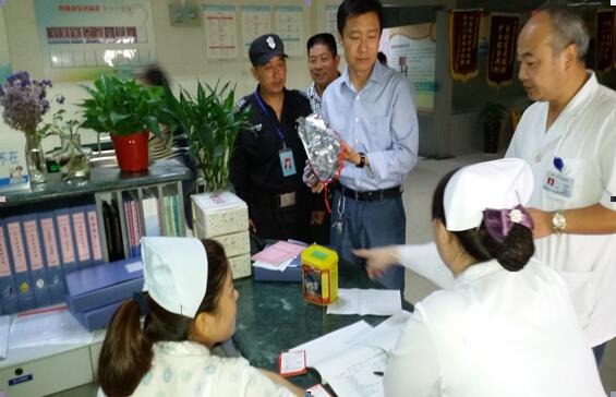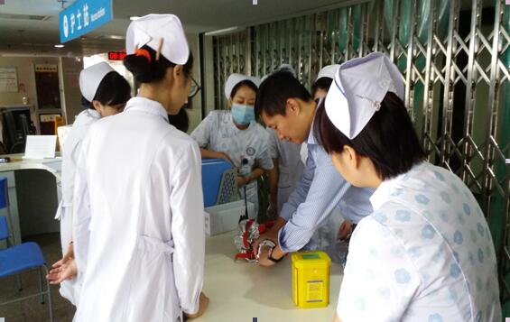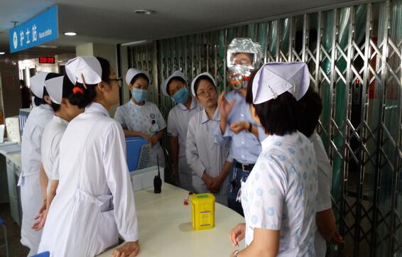 保卫科人员在病区护士站培训自救呼吸器的使用方法