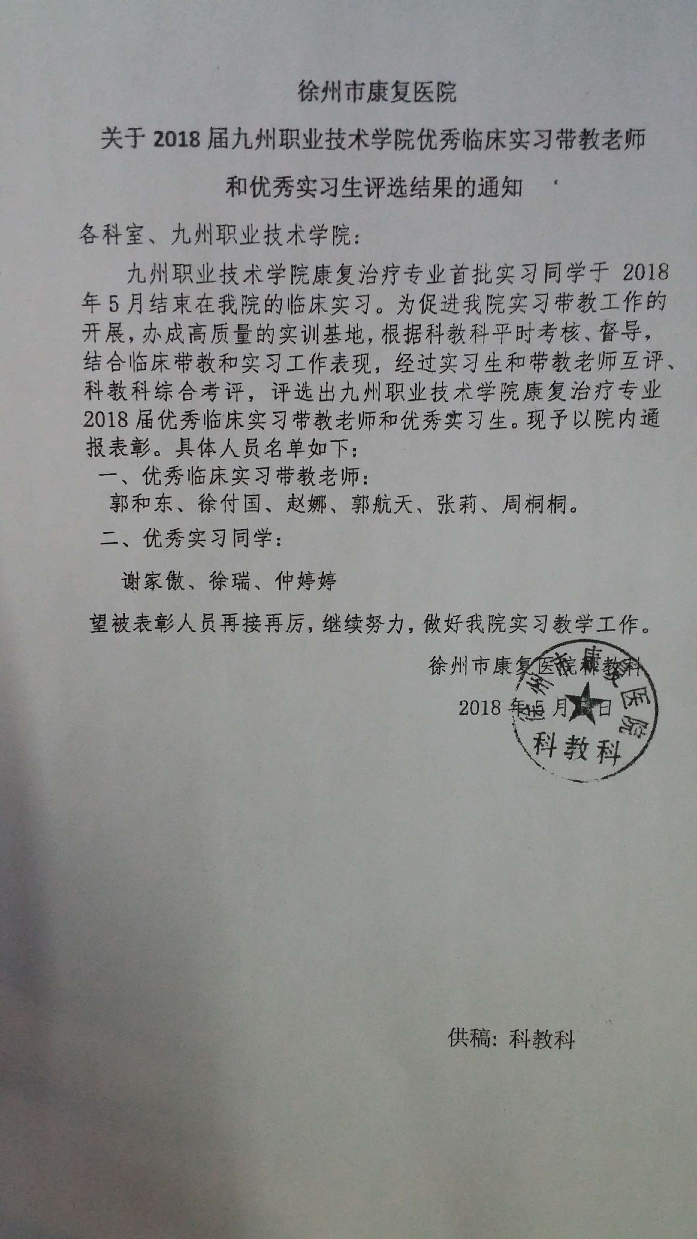 自7月3日第一批九州职业技术学院的康复治疗专业学生进入我院实习以来,科教科不仅对实习生进行岗前培训及考核,还定期组织在岗实习情况督查,面对面听取同学们及老师对带教方面和实习情况的反馈;定期召开学生及带教老师的安全会议,强化实习安全。