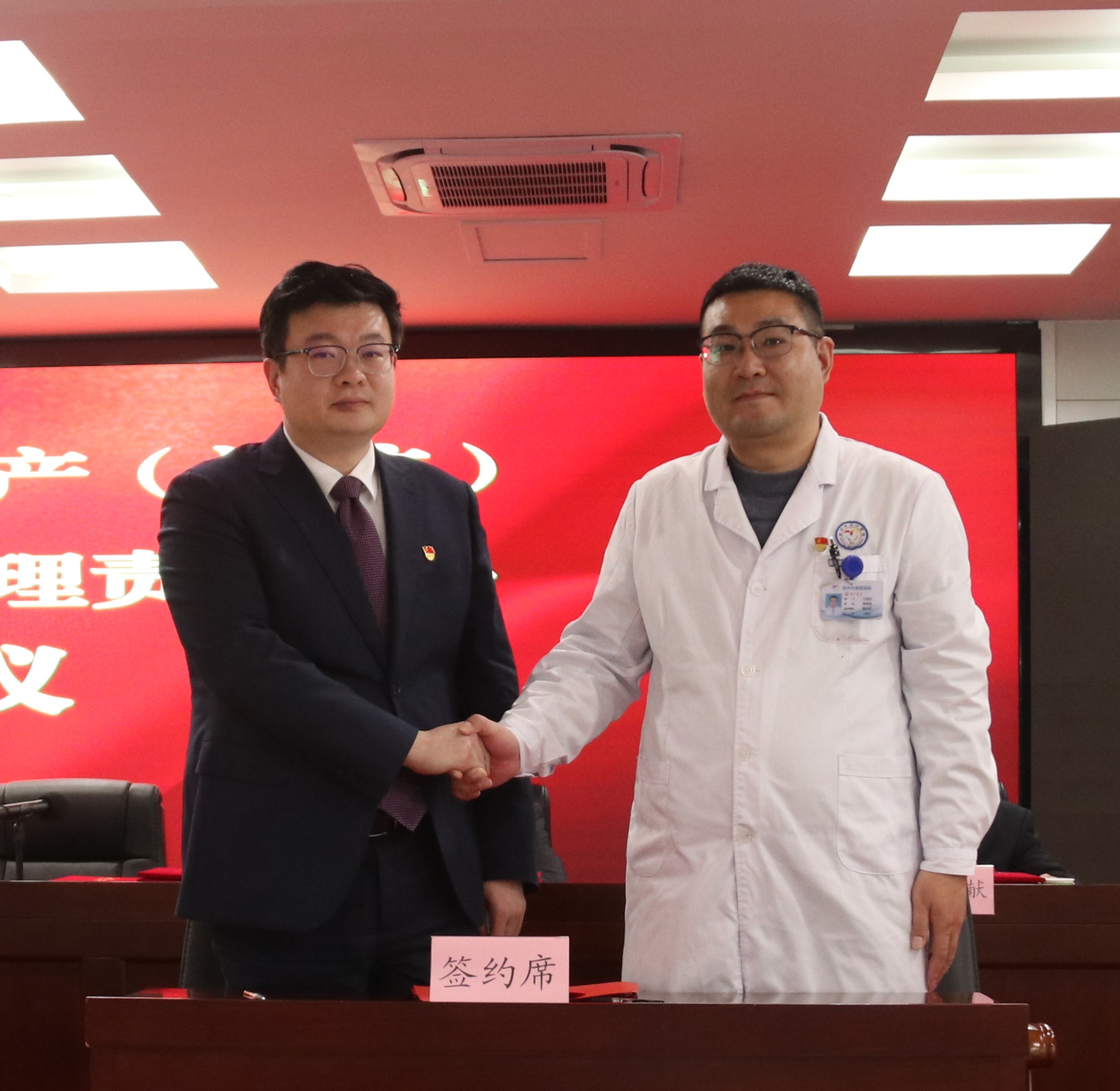 陶子奇与临床、医技、职能科室负责人代表签订《2025年度综合目标管理责任书》《2025年度安全生产(消防)综合治理目标管理责任书》。