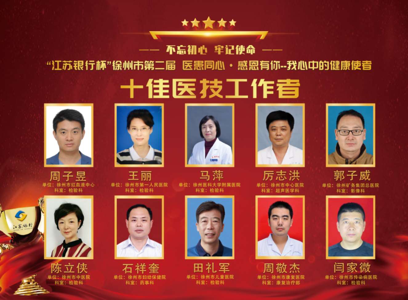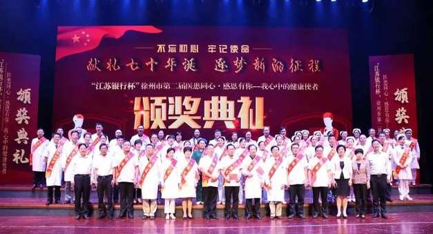 为庆祝中华人民共和国成立七十周年,深入开展 “不忘初心 牢记使命”主题教育活动,9月27日,徐州市卫健委在音乐厅举办了“献礼七十华诞,逐梦新的征程”——徐州市第二届我心中的健康使者颁奖典礼。我院康复治疗师周敬杰被授予“十佳医技工作者”称号,护士张雪荣获“十佳护士”提名。他们不仅是全市医技工作者和护士的榜样人物,他们也是全职院干部职工的骄傲。
