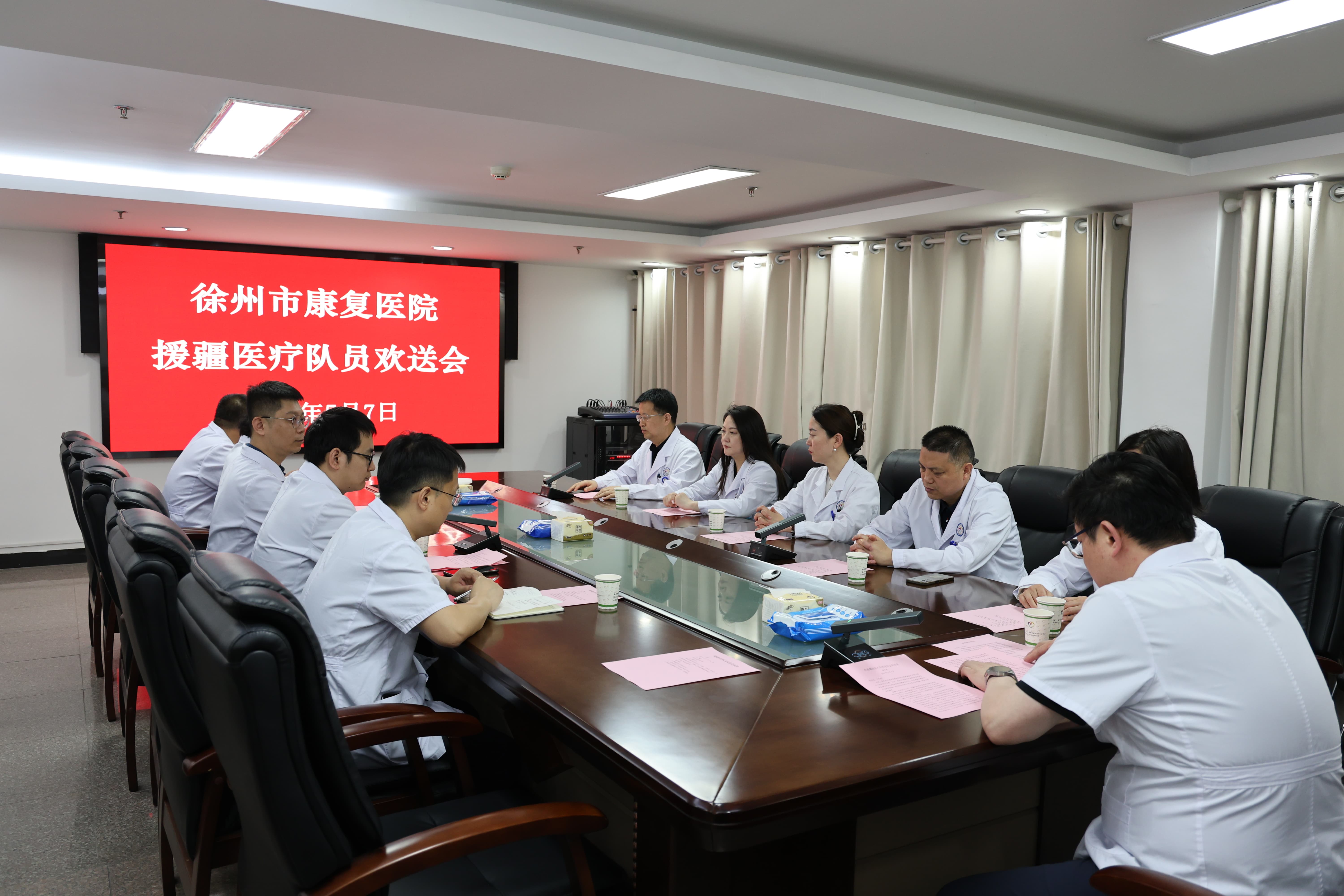 2025年5月7日下午,徐州市康复医院在B座七楼东会议室举行援疆医疗队员欢送会。党委副书记、院长陶子奇等院领导班子成员 ,援疆医疗队员姜效韦及院办公室、人事科、医务科、科教科、宣传科、工会等职能部门负责人参加会议。会议由副院长巩尊科主持。