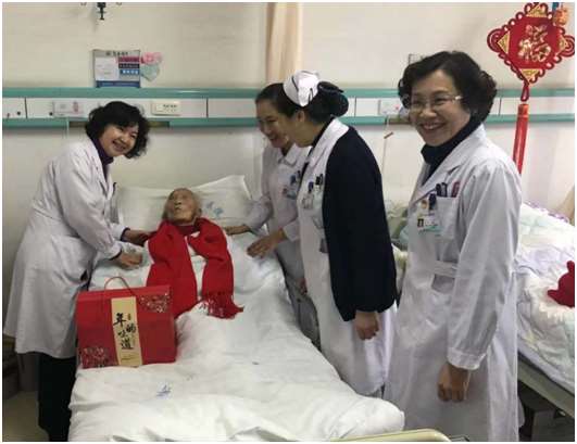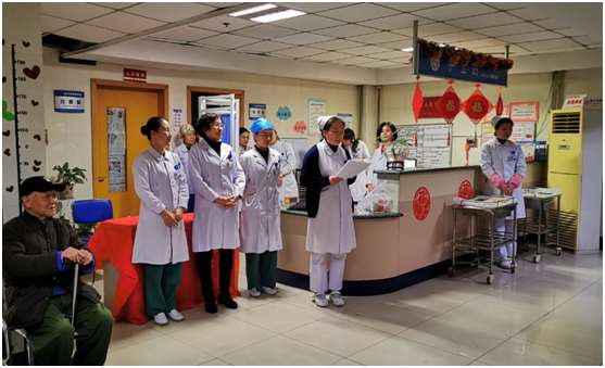 联欢互动后,医务第一党支部党员到病房,慰问了6名在院的离退休老干部及百岁老人张杰,送去关怀与温暖。