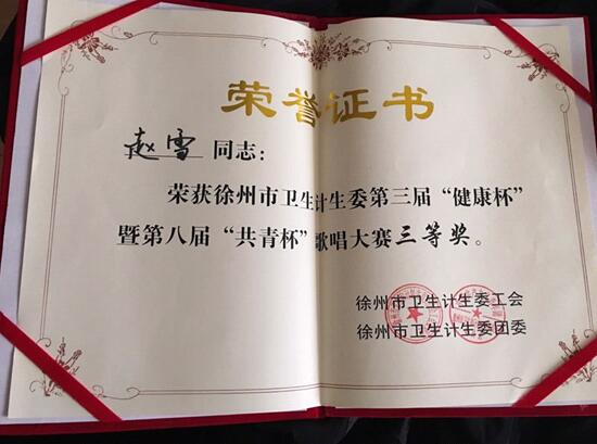 2017年4月1日,徐州市第一人民医院综合楼六楼会议室,市卫计第三届“健康杯”暨第八届“共青杯”歌唱比赛如期举行。来自全市卫生系统的30余名参赛选手跃跃欲试。选手们在舞台上挥洒自如、尽情歌唱,赢得现场评委和观众鼓掌喝彩声接连不断。