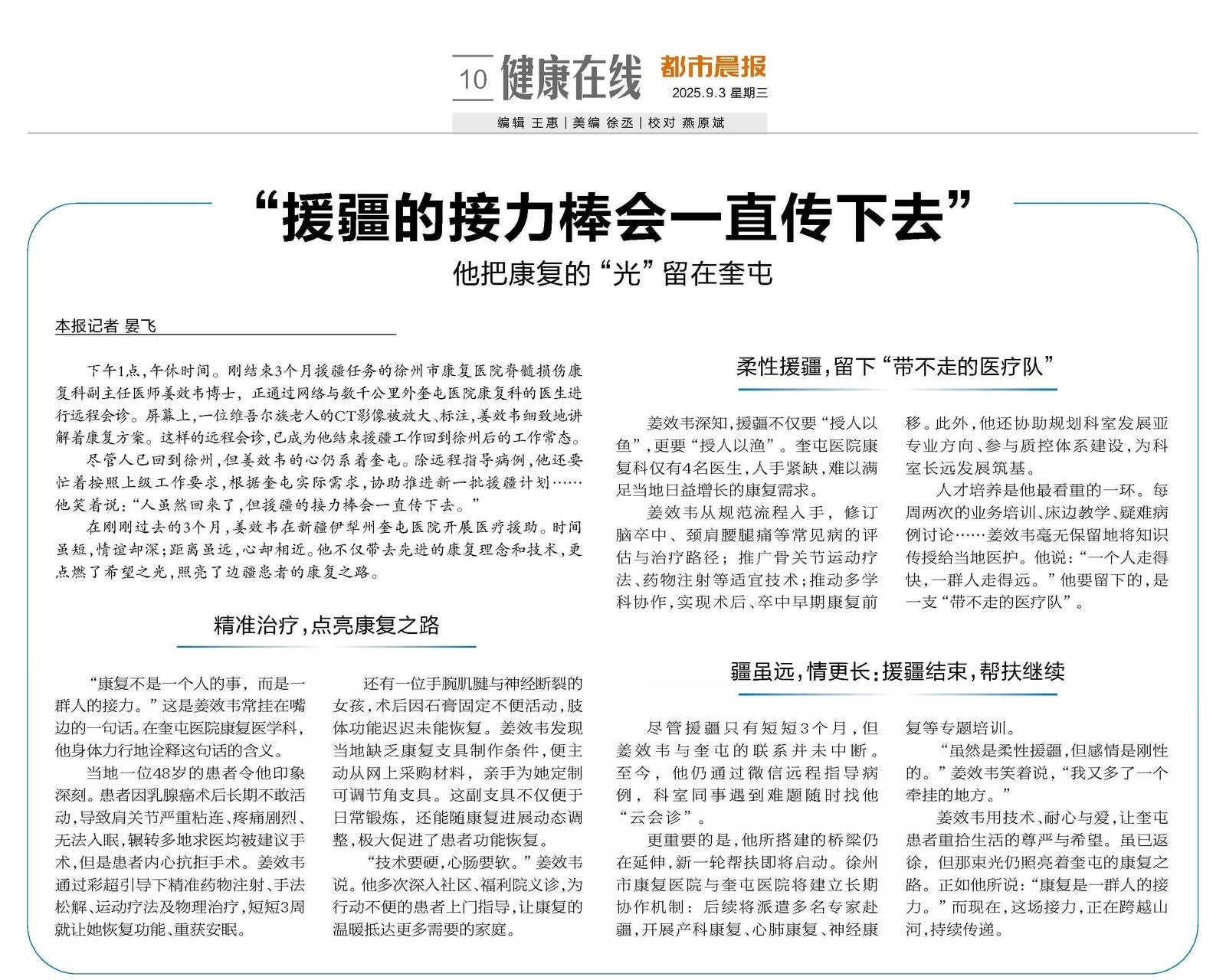 姜效韦用技术、耐心与爱,让奎屯患者重拾生活的尊严与希望。虽已返徐,但那束光仍照亮着奎屯的康复之路。正如他所说:“康复是一群人的接力。”而现在,这场接力,正在跨越山河,持续传递。
